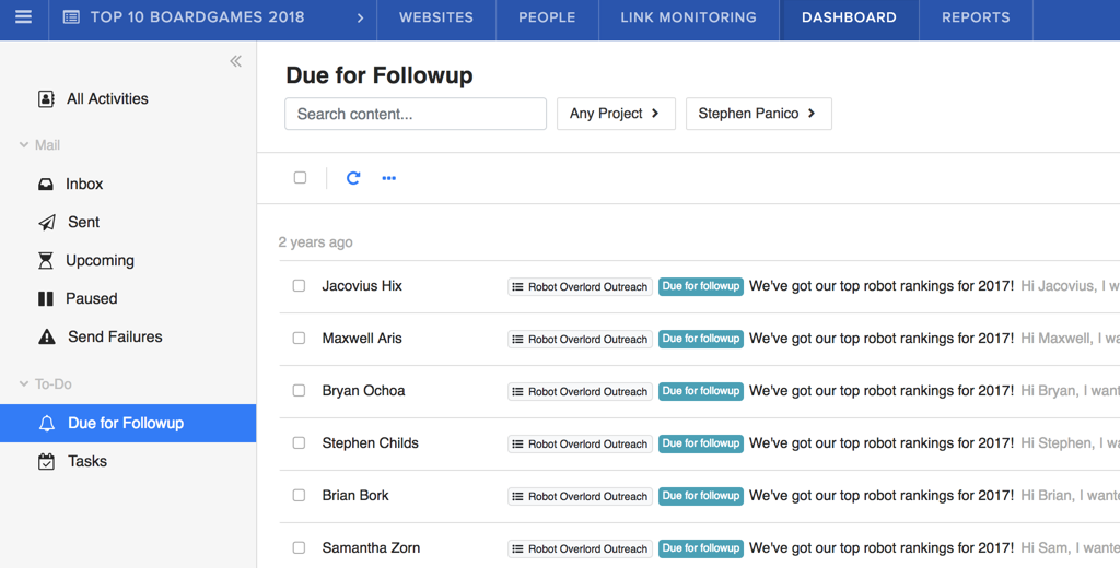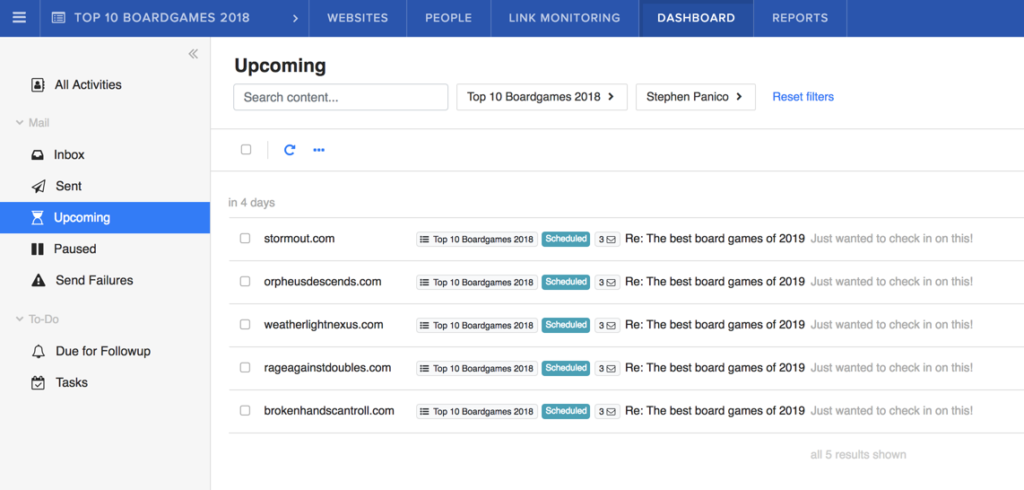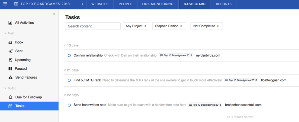 This folder gives you a convenient way to work through all of your open tasks without ever leaving the dashboard. That process is particularly helpful if you have assigned various tasks specifically related to outreach. For instance, if you tied a task to following up on your outreach you could handle all of those through the “Due for Followup” folder then quickly mark your task as complete in the Tasks folder, all without losing your place.