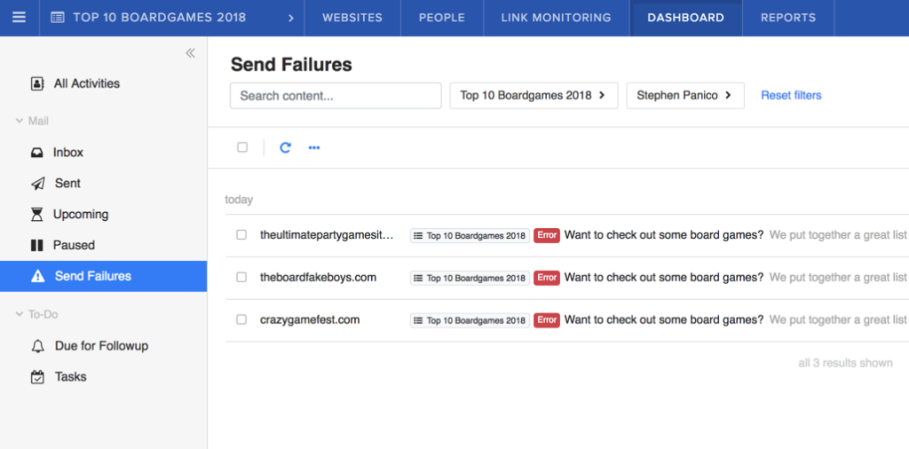 The Send Failures folder will let you access all of the emails that have failed to send through BuzzStream. You can review these emails, determine the best course of action, and once everything is settled you can retry sending them right from the folder.