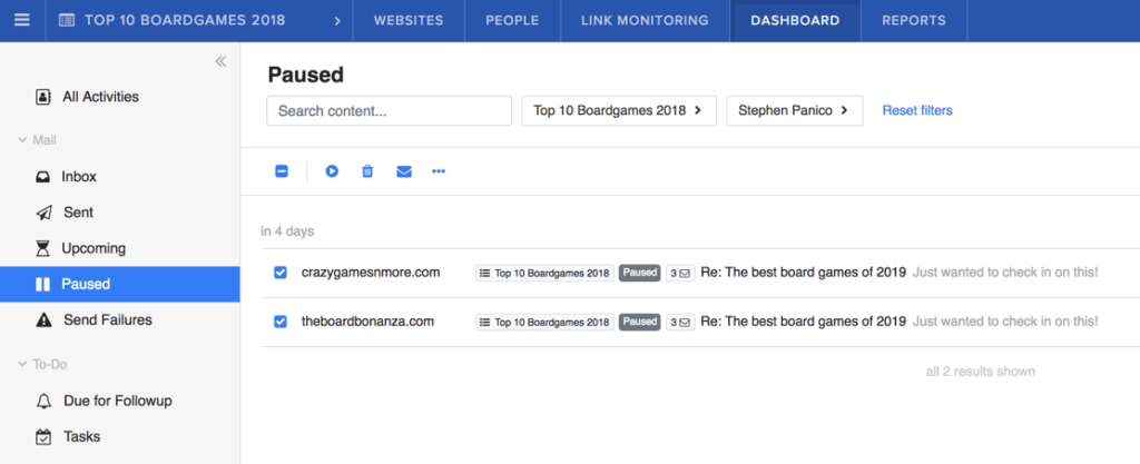 You’ve also got two “To-Do” folders that will prompt you to take action within BuzzStream. The first of these is the Due For Followup folder. Any contacts that have followup reminders set, either manually or as a sequence rule, will appear here when the right conditions have been met.