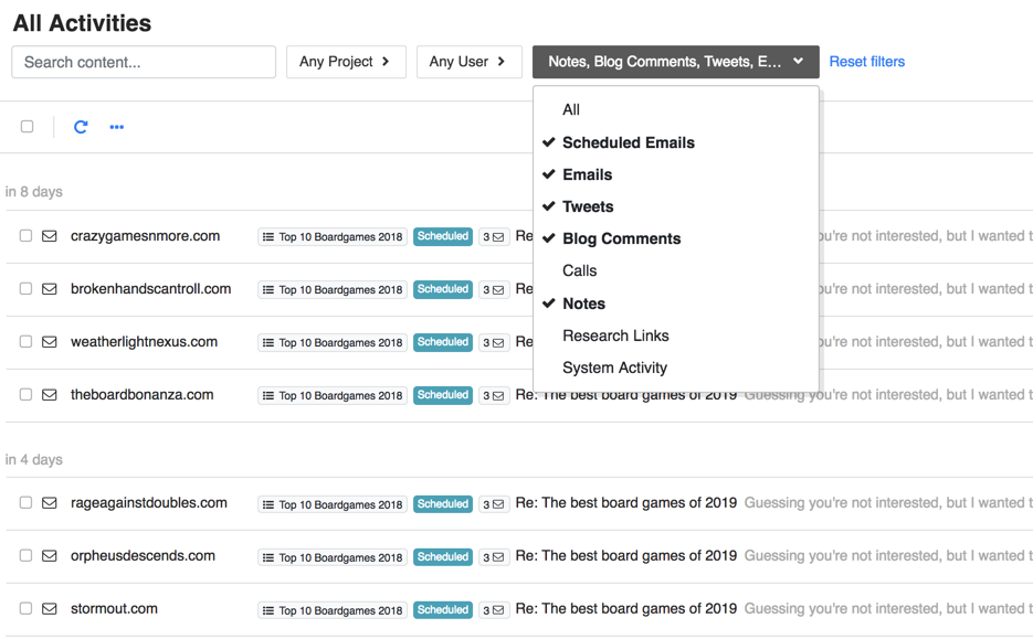 So if you wanted to quickly see all of your outreach as well as notes made by your team about those outreach efforts, you could just navigate to All Activity then filter across all projects and all users for emails, tweets, blog comments and notes for a complete view into your outreach for a project.