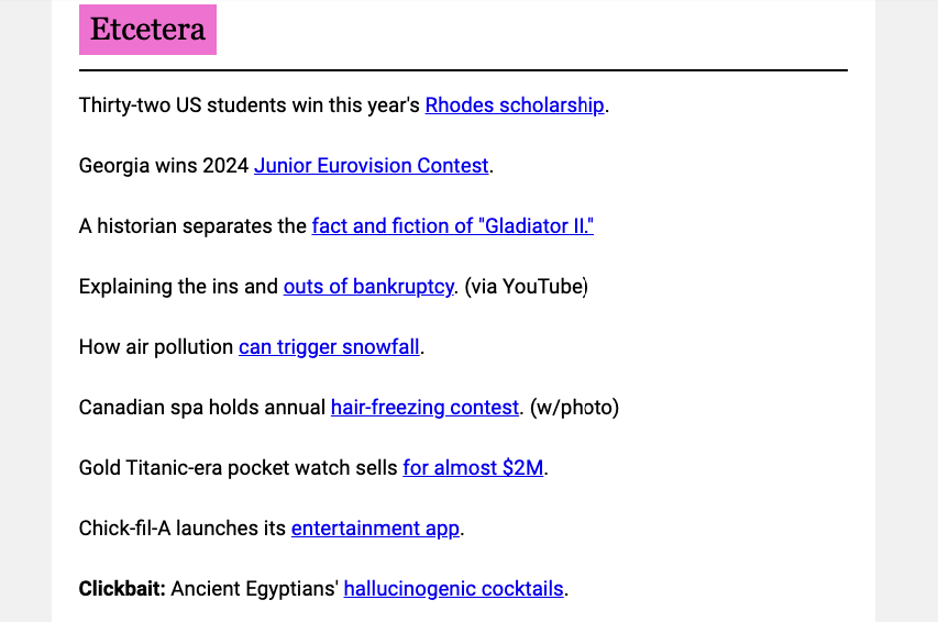 Here, the newsletter curators show a mix of random (interesting) articles from around the web.