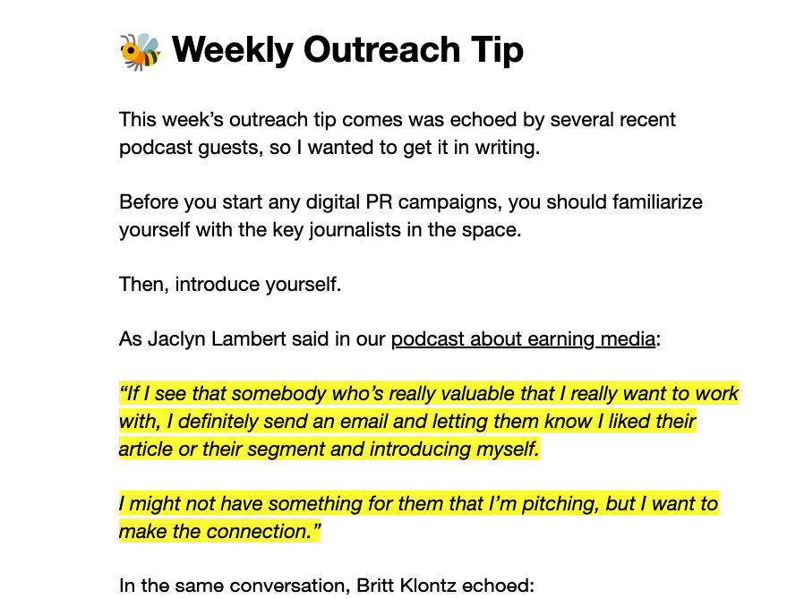 The feature I spend the most time crafting is the weekly outreach tip. It’s custom-written weekly based on my personal outreach experience or tips from expert guests.