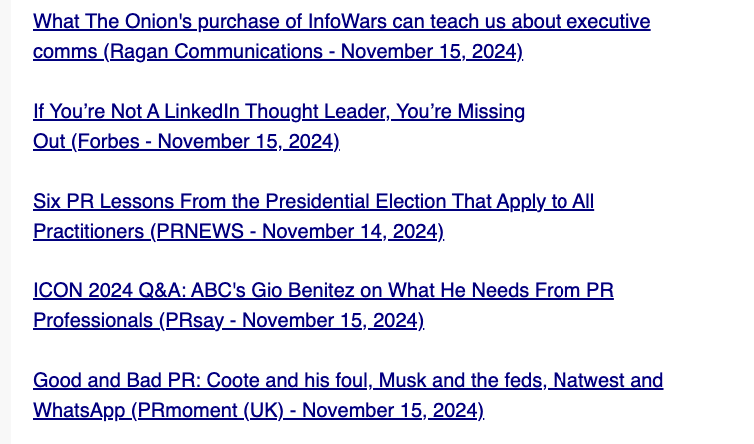 This newsletter also covers key stories from smaller pubs you may have missed and stories from more prominent PR news outlets like Ragan.