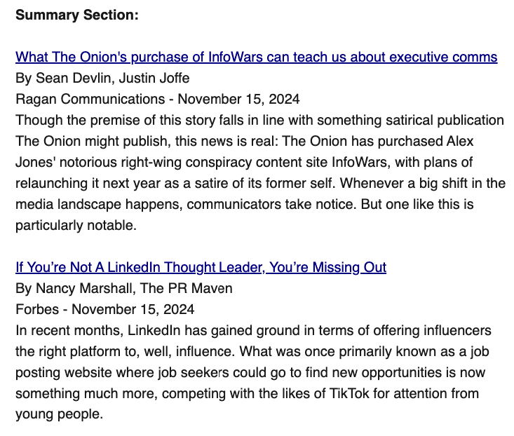 I like having a newsletter that highlights essential takeaways from a news story. This helps me decide whether to click and read it further. (Nick LeRoy’s SEO For Lunch Newsletter also does this well.)