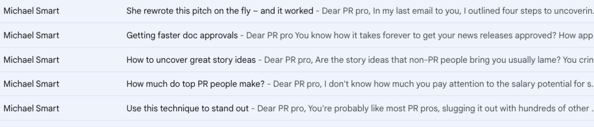 Michael Smart’s emails deliver concise PR advice in a conversational format, perfect for people like me who want tips without feeling overwhelmed by information.
