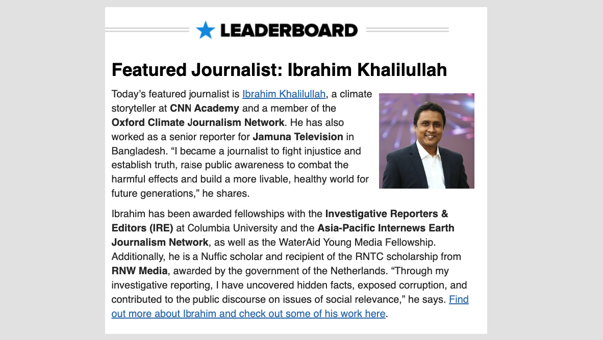 One feature I like is their “Leaderboard,” which features a journalist in the industry doing great work.