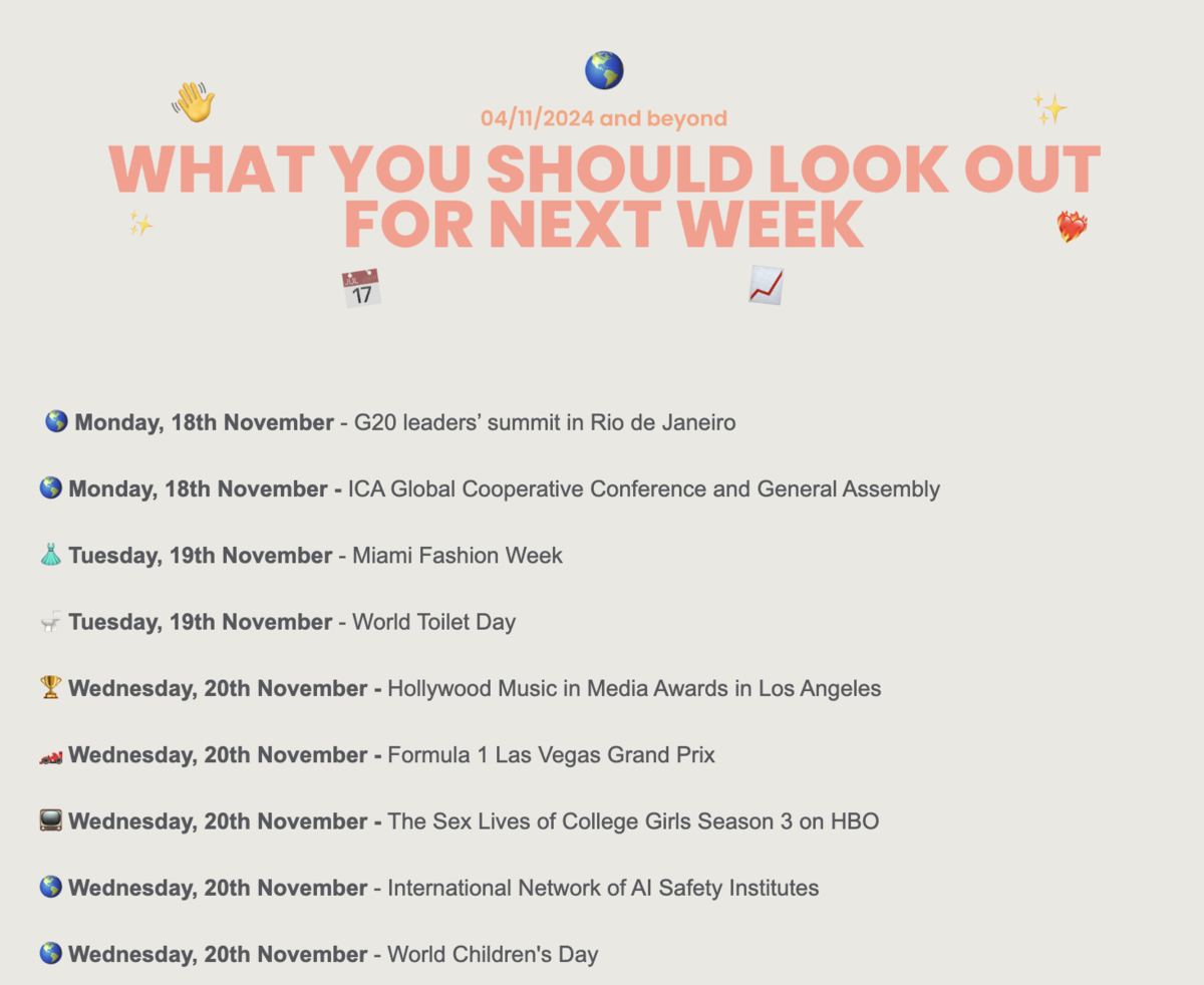 Last is a complete list of major events in the coming week that will help you plan campaigns or reactives around these events.