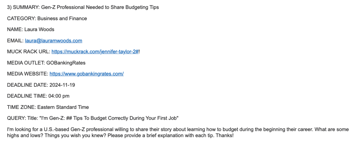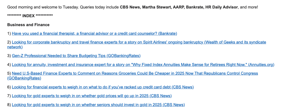 The newsletter itself is a list of journalist queries like the one you see below:
