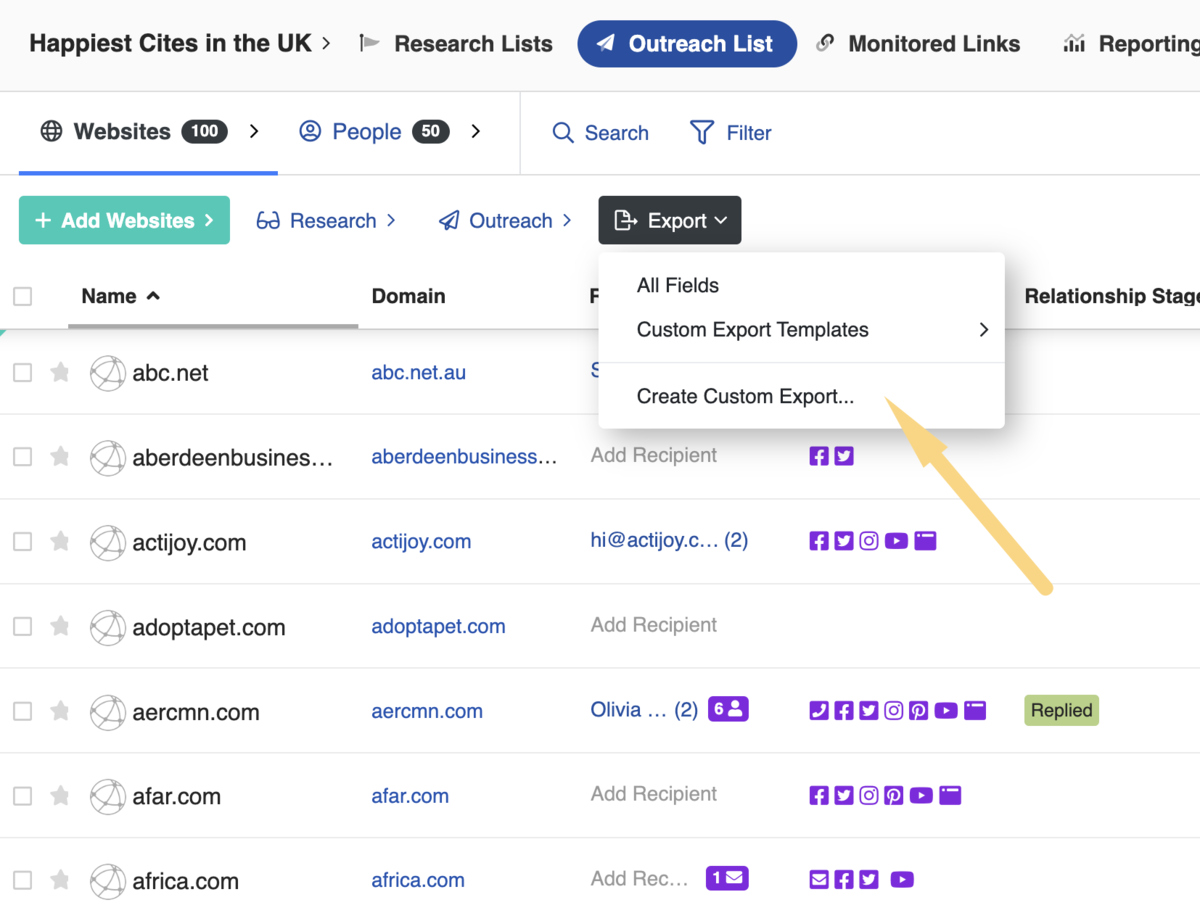 Remember, in BuzzStream you can easily export outreach lists by clicking the “Export” dropdown.