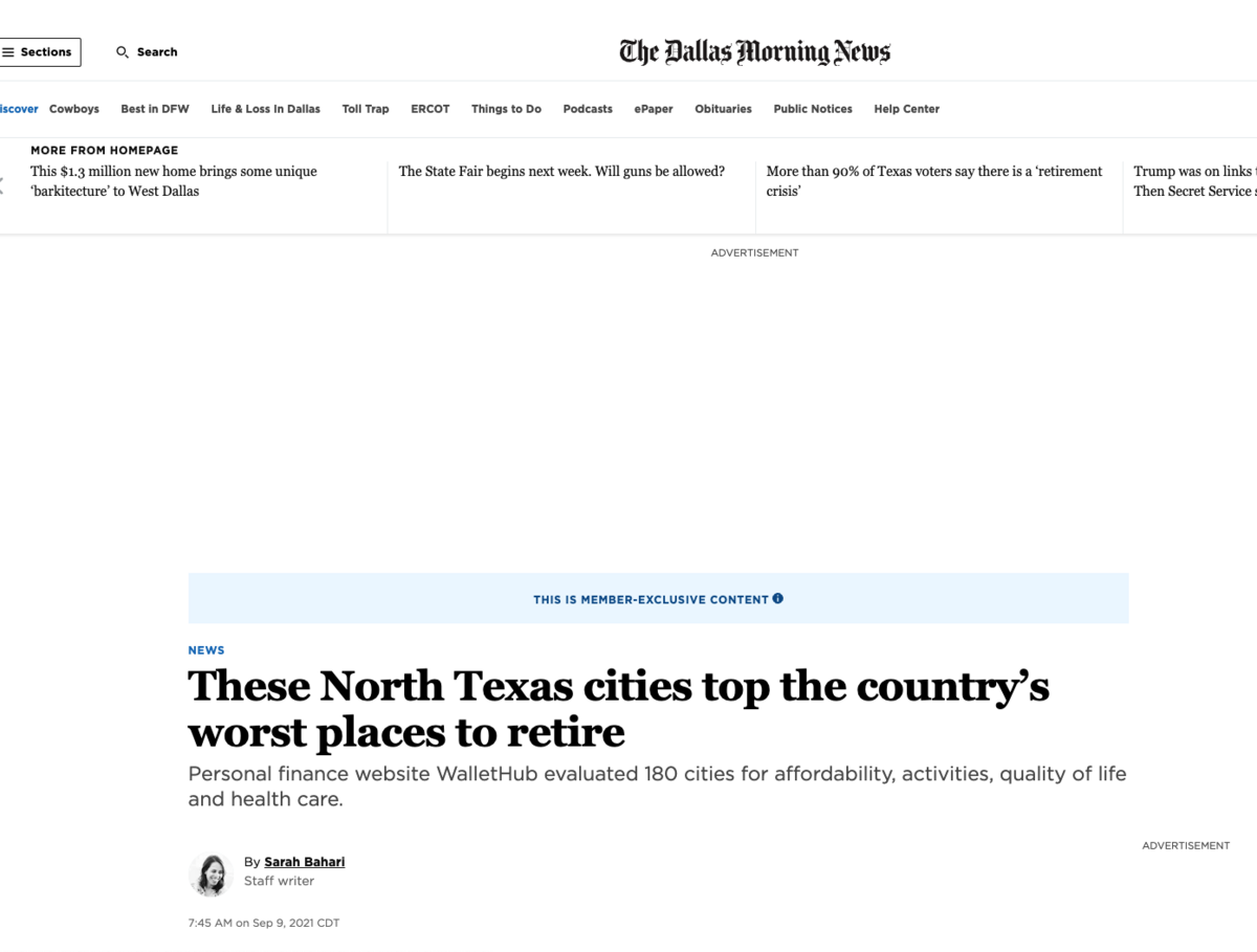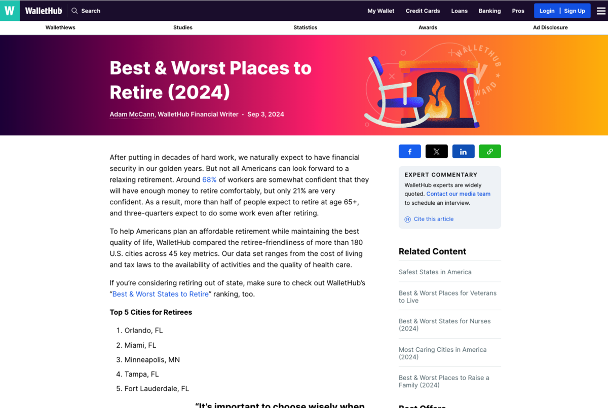 For example, WalletHub publishes articles like “The Best Cities to Retire” annually. They analyze and rank cities based on several factors.