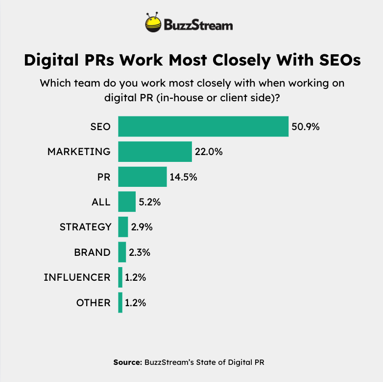Most digital PRs (50.9%) work closely with the SEO teams. This was somewhat echoed in our podcast conversation with digital PR expert, Will Hobson of Rise at Seven.