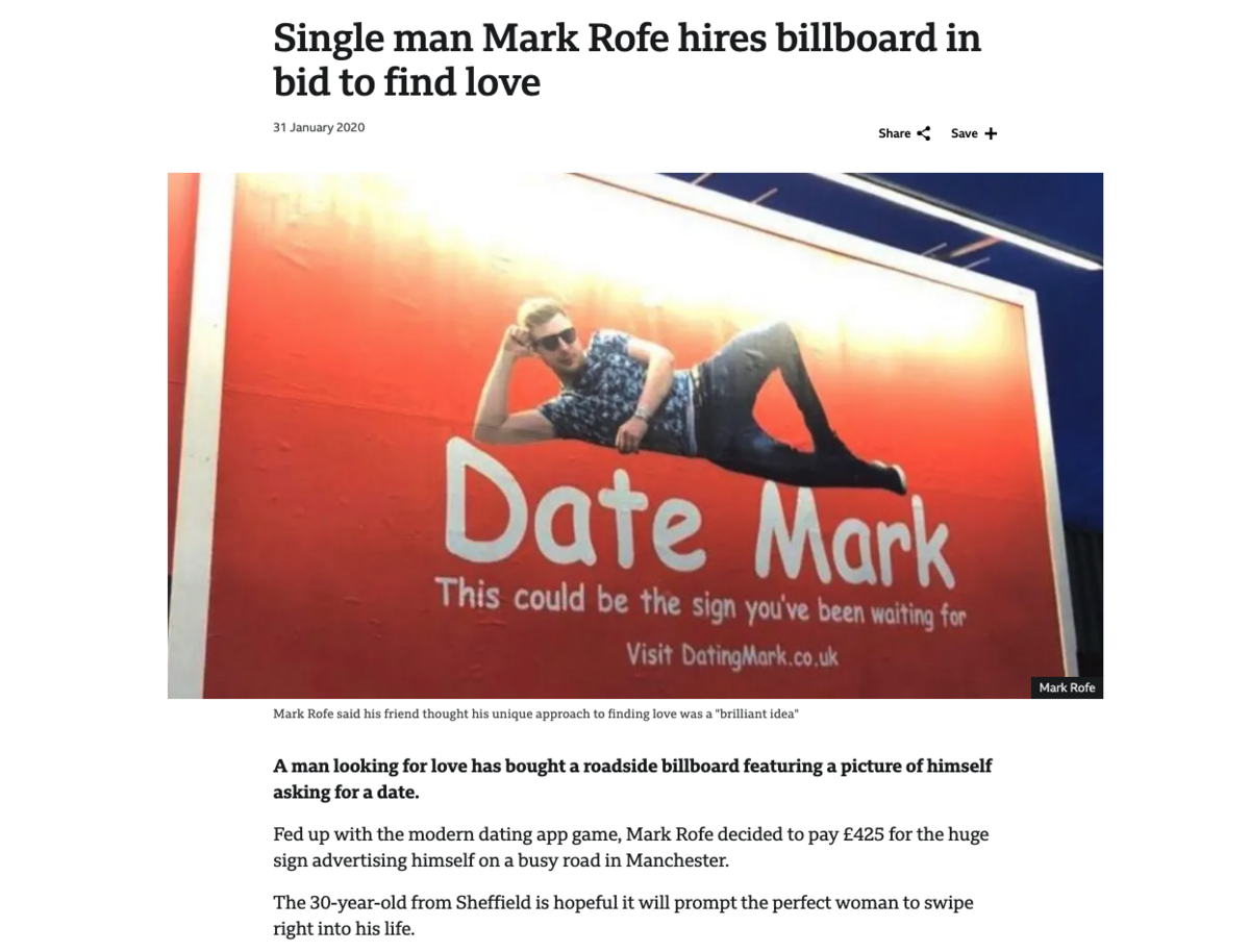 For example, the digital PR expert behind The Digital PR Newsletter, Mark Rofe, once took out a billboard in the UK to find a date.