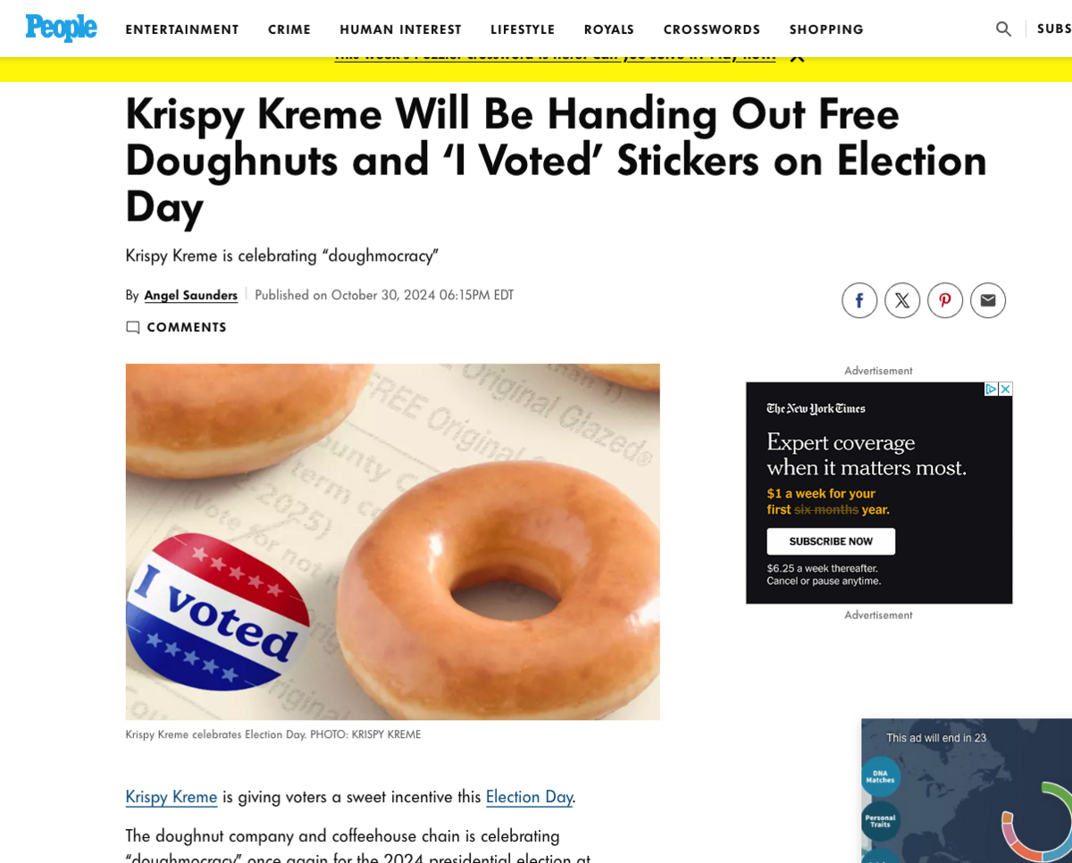 Or Krispy Kreme’s announcement of free donuts on Election Day (to celebrate “doughmocracy,” of course!)