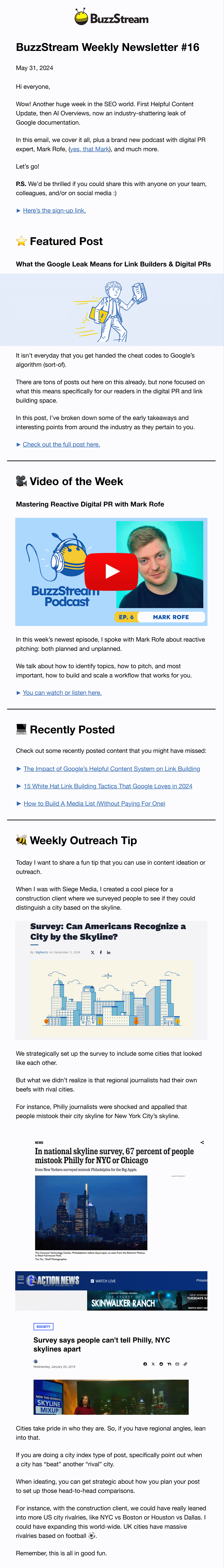Our weekly newsletter goes out to thousands of hungry digital PRs, link builders, and SEOs.