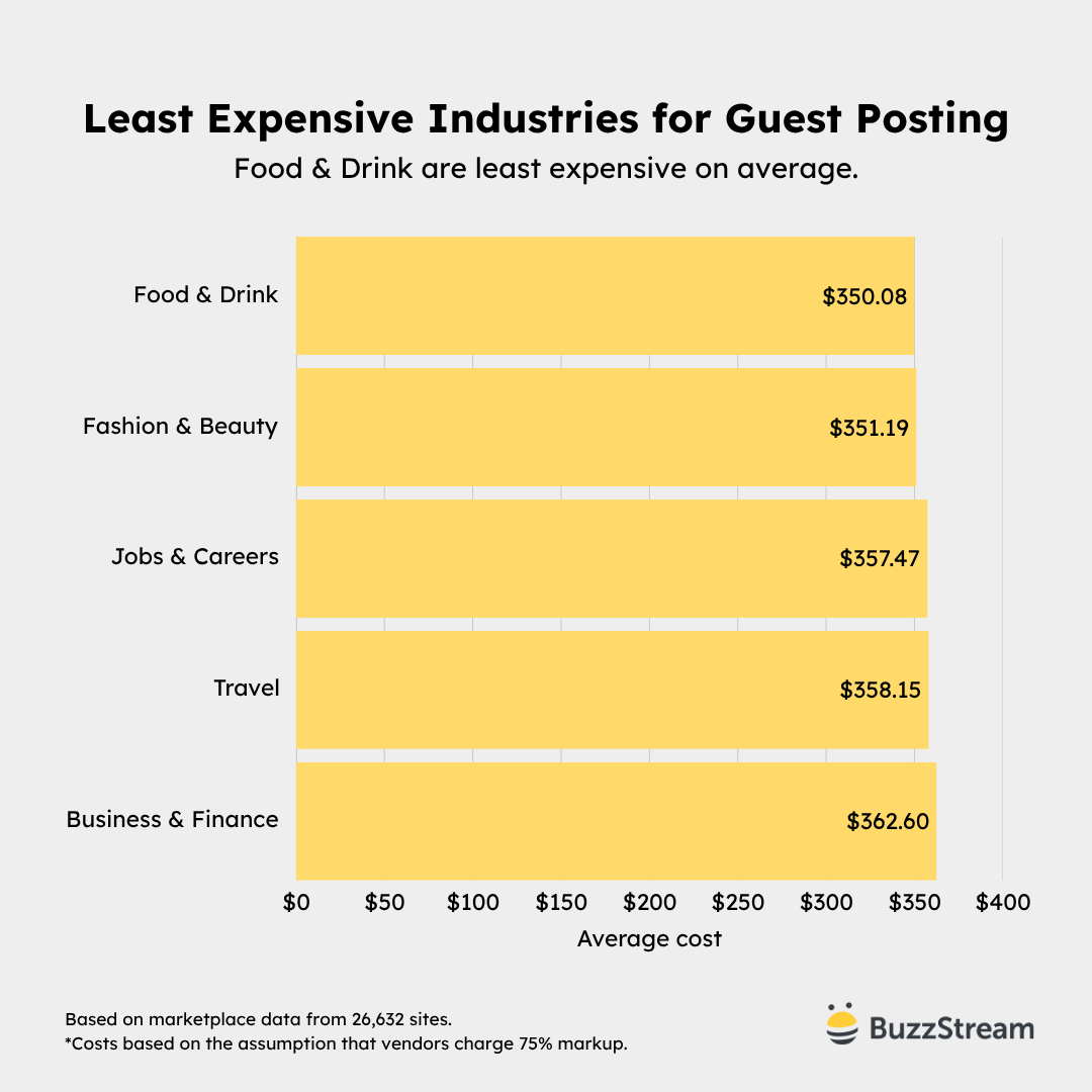 When digging into the least expensive options, we find that on average, you can get a Food & Drink or Fashion & Beauty guest post for around $350.