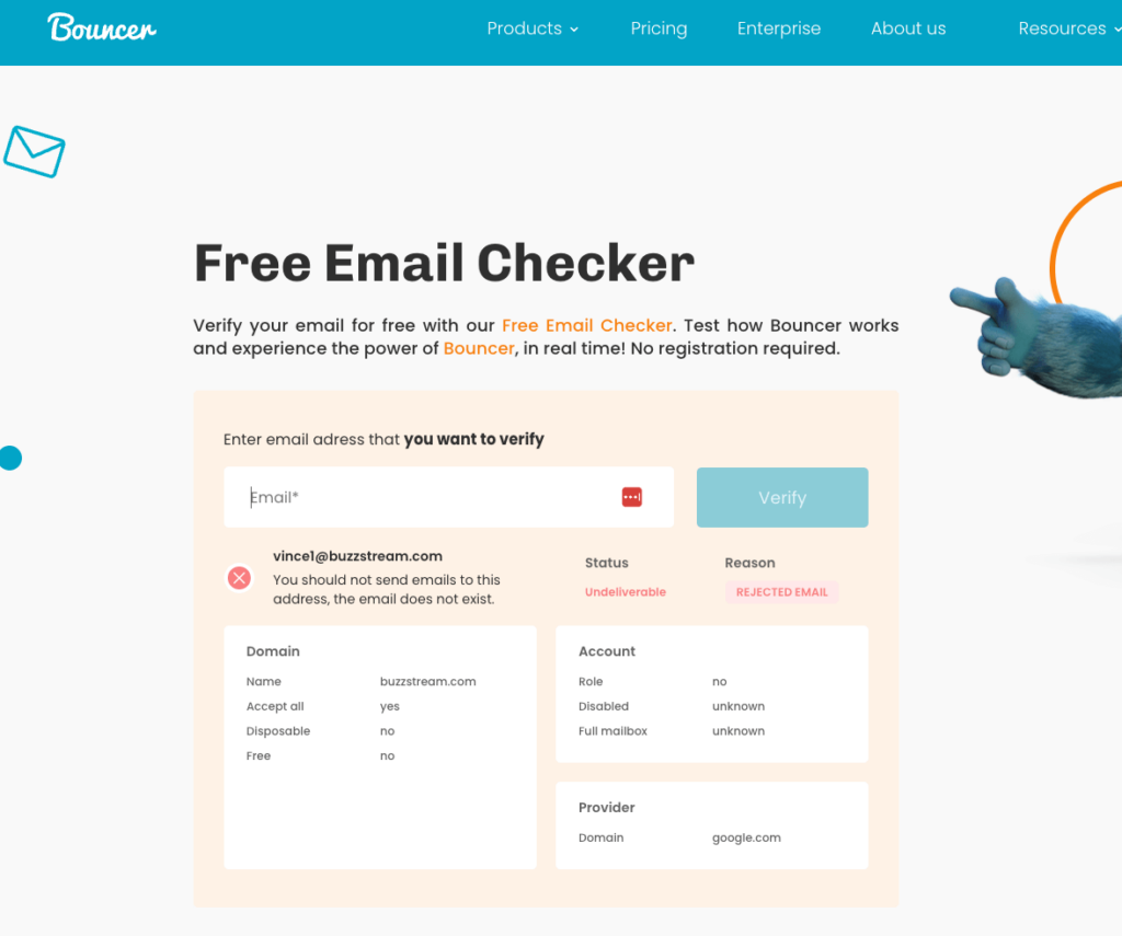 Bouncer gives five free verifications without signing up and 100 free if you sign up for a free account.