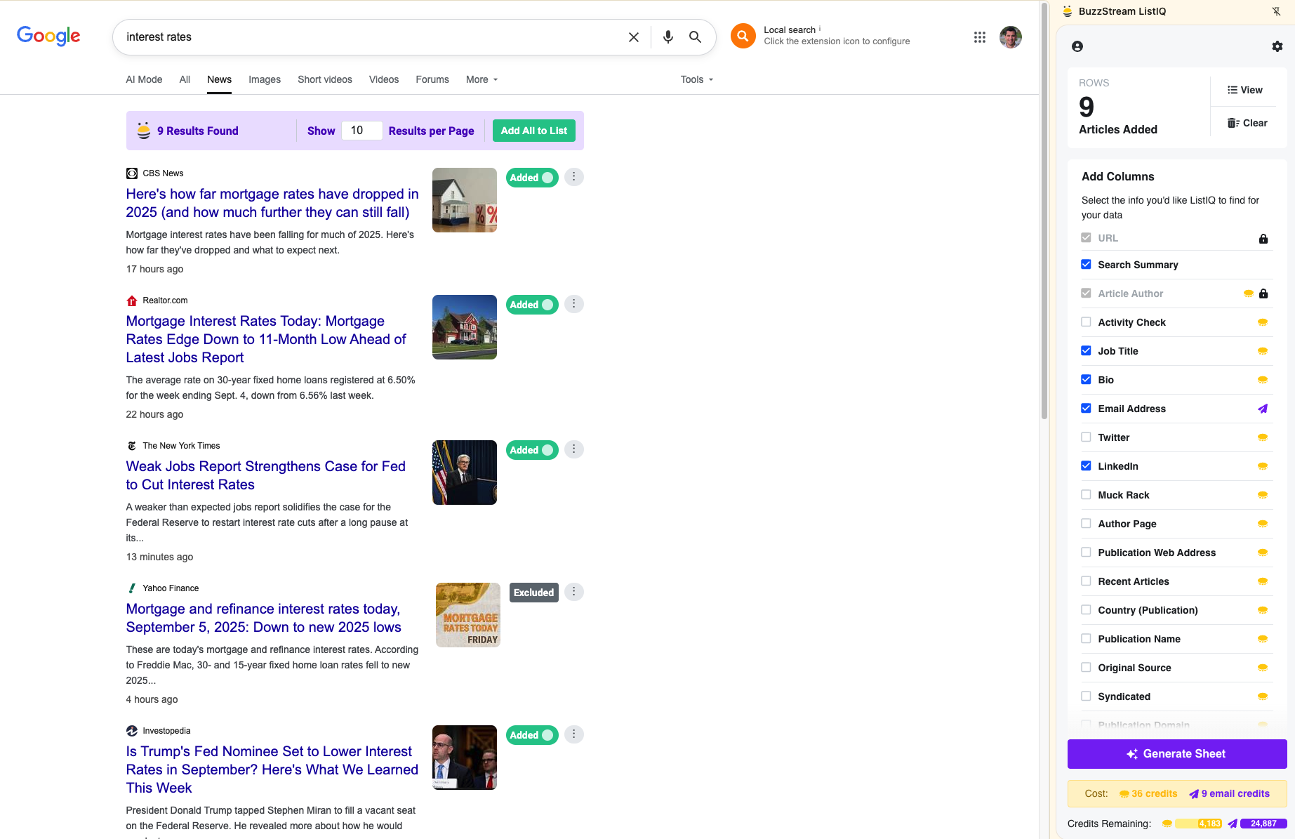 BuzzStream ListIQ can find journalists’ email addresses directly from a Google News search.