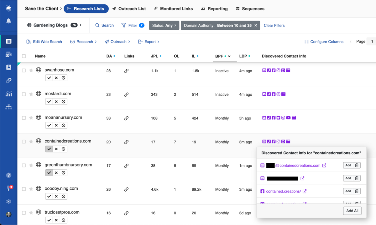After generating my research list, I did some light sorting and filtering based on simple metrics, like domain authority, recent post date.