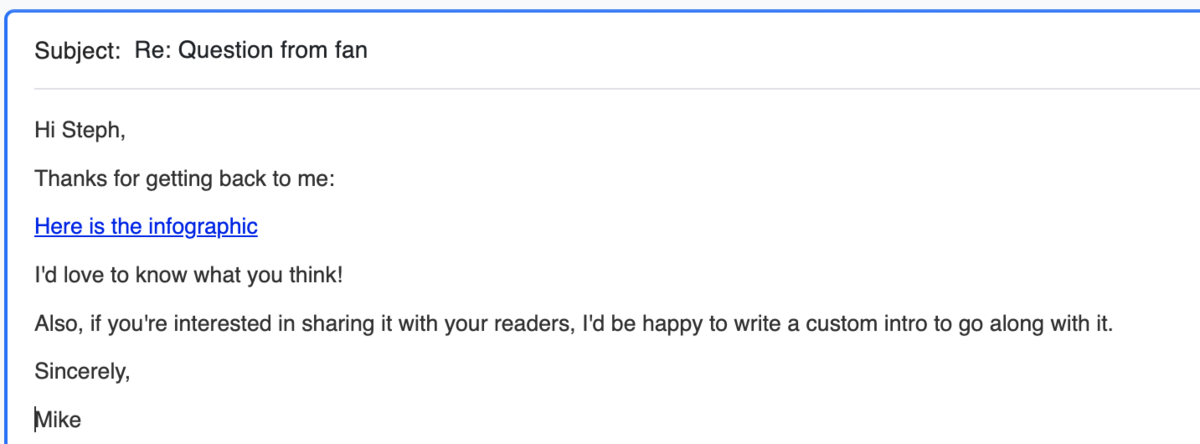 If you want someone to share your content, you need to answer the question that’s on their mind: “What’s in it for me?” Remember, when a blogger publishes your infographic, they have to create additional content to accompany it and might only get a bit of traffic for all that effort.