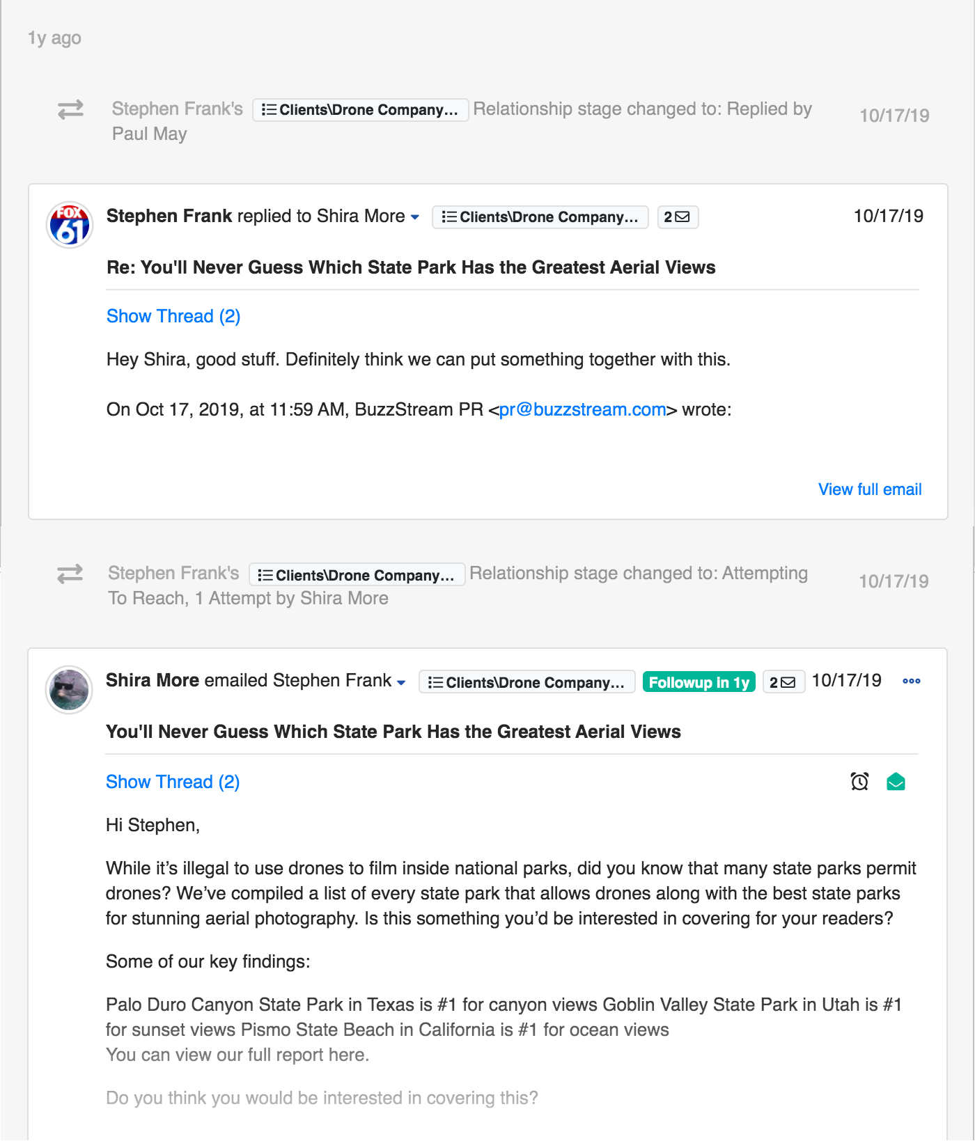 View the conversations your teammates have had with contacts, so you can always send smart, informed outreach.