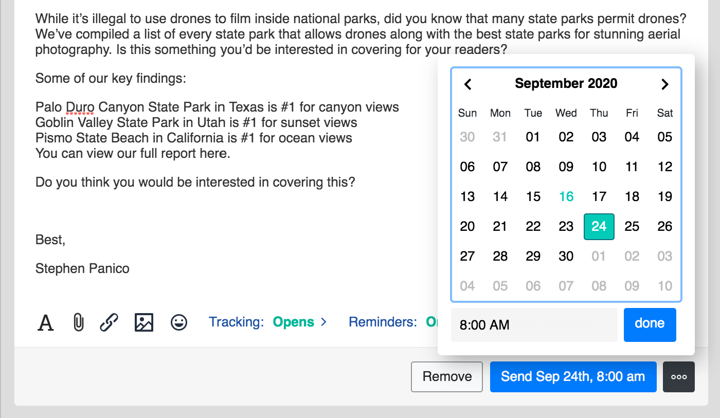 Choose a time to send your outreach message, so your prospects receive your message at exactly the right time.