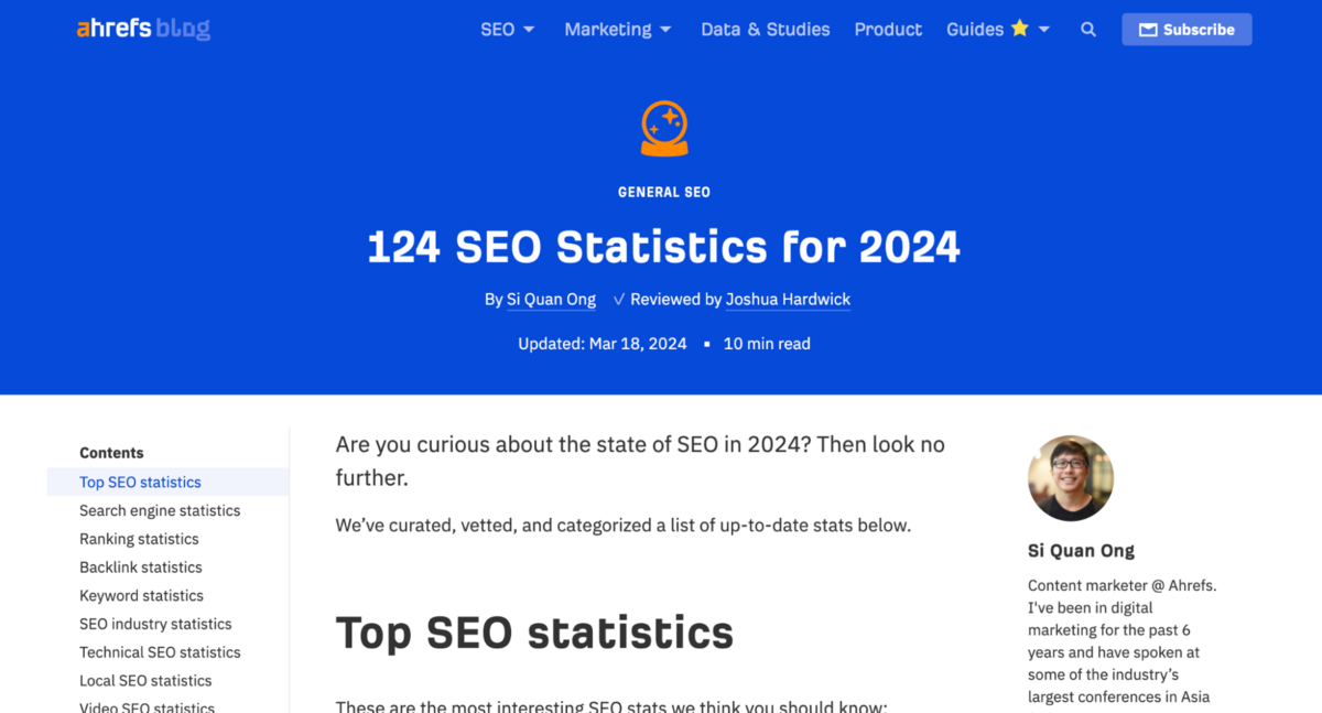 For example, they’ve generated over 1,777 referring domains to their SEO Statistics post. The post also ranks for “SEO statistics,” bringing in 1.1K monthly traffic.