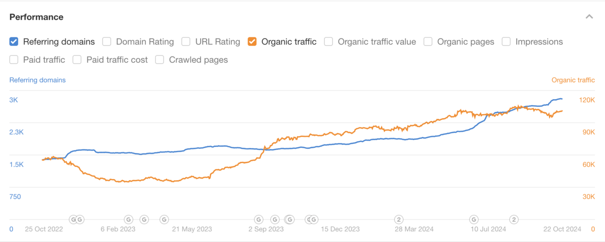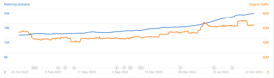 If you look at their traffic graph, you can see that there was an initial Link Spam Update in December 2022, and their traffic hasn’t grown since.