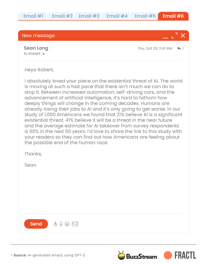 We collected results from 500 Media professionals working in digital PR, journalism, digital marketing, and promotions. The survey was designed with the intent of testing human perceptions of AI-generated subject lines and email pitches presented to them. Respondents were not informed that subject lines and emails were AI-generated. Limitations due to self-reporting apply, including exaggeration, telescoping, and selective memory. Subject lines and emails were generated using GPT-3, a text-generating program from OpenAI. GPT-3 was given a set of prompts in order to generate email pitches, but for efficiency, not every variation of each prompt was used. GPT-3 output could vary based on word count and word variation of prompts.