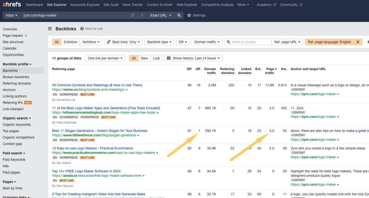 I can use Ahrefs’ “Best links” filter to identify the number of quality links. I’ll set DR to greater than 75 and the Traffic to greater than 10000.