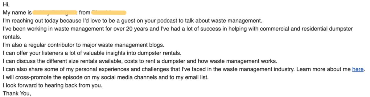 I get many emails pitching guest post ideas that aren’t remotely relevant to BuzzStream. Once, someone pitched me on writing a guest post about garbage bin rentals: