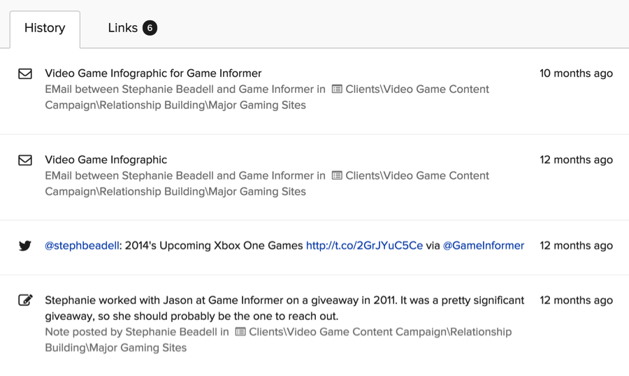 One particular aspect of BuzzStream that we use on a daily basis is the notes section. The details collected there provide helpful insight into a relationship for those who were not involved in the original interaction between our team and a prospective collaborator. Whether a contact recently changed jobs or reacted really well to a specific pitching technique, we can learn from past interactions to make future outreach efforts more effective.
