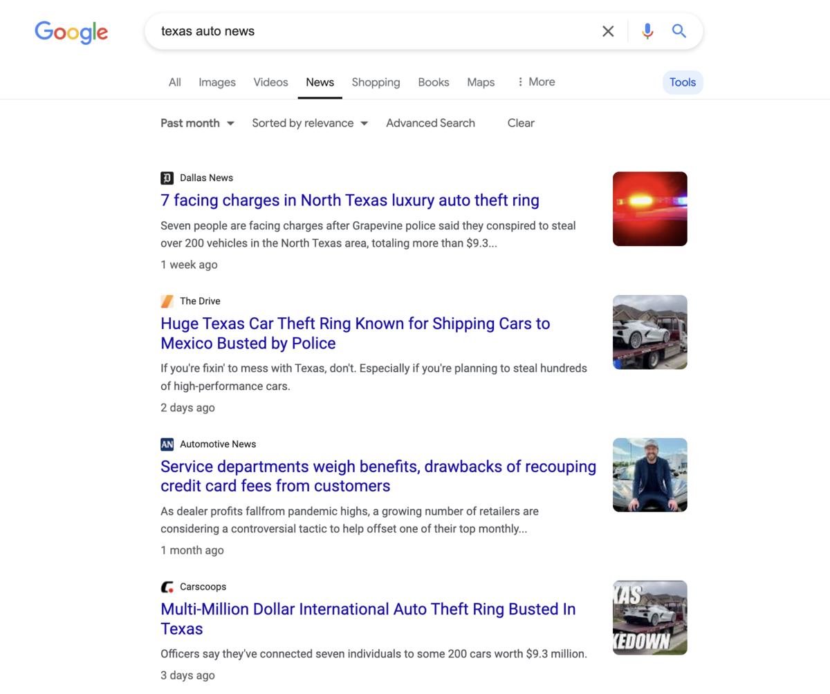 We can search Texas auto news in Google News and set the date range to the past month. This will allow us to find articles written about our topic.