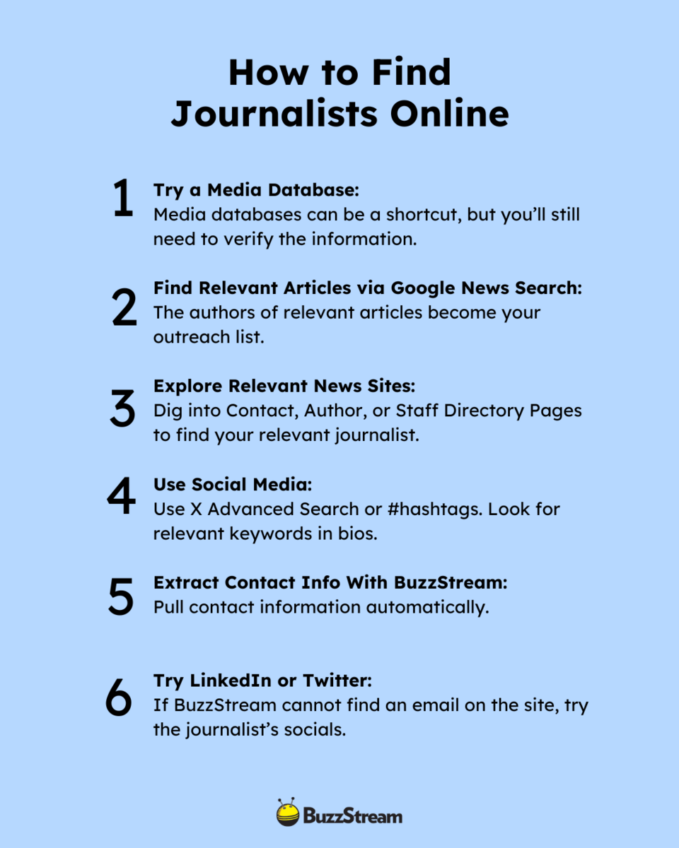 Utilize social platforms (especially X/Twitter) and staff directories to connect with journalists directly.