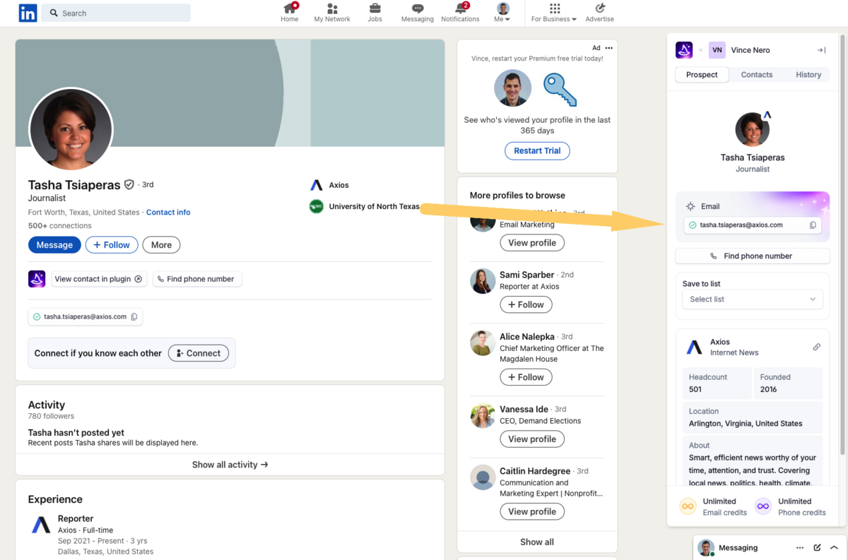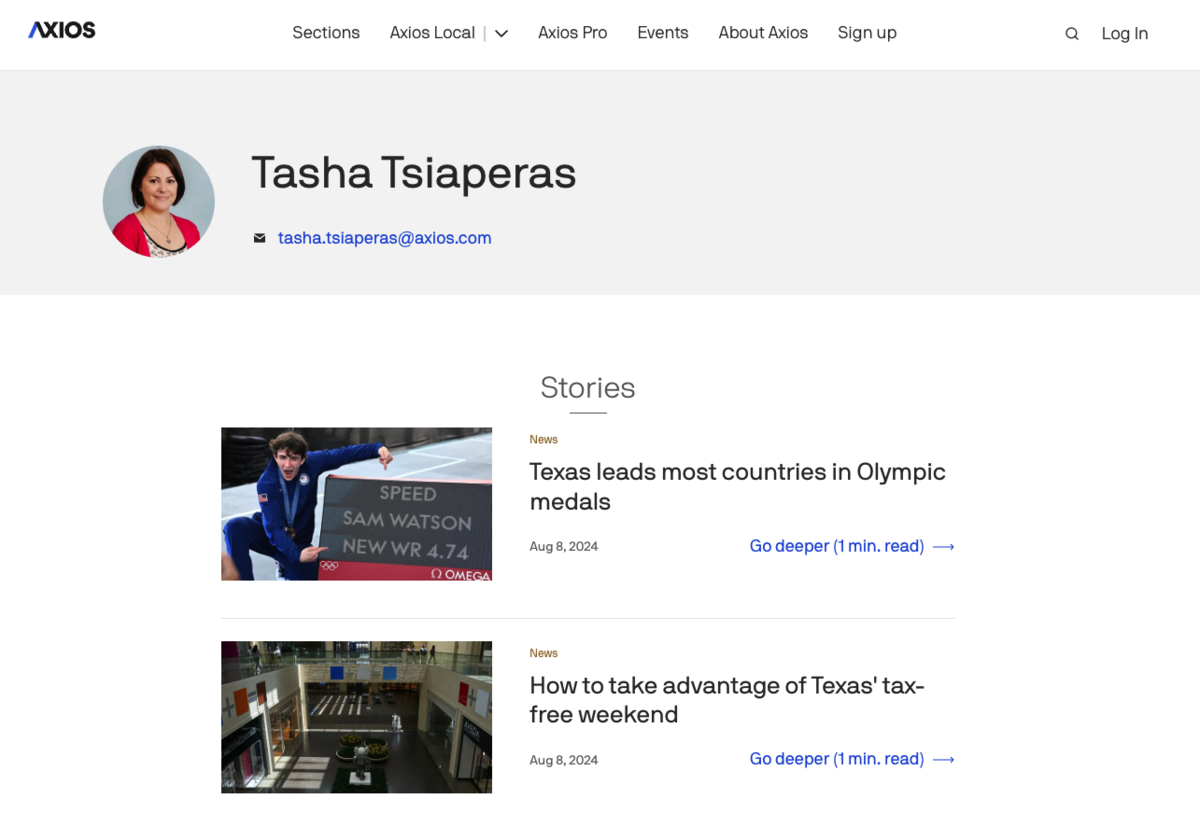 For example, here is a journalist who writes for Axios, with her email listed directly on the page: