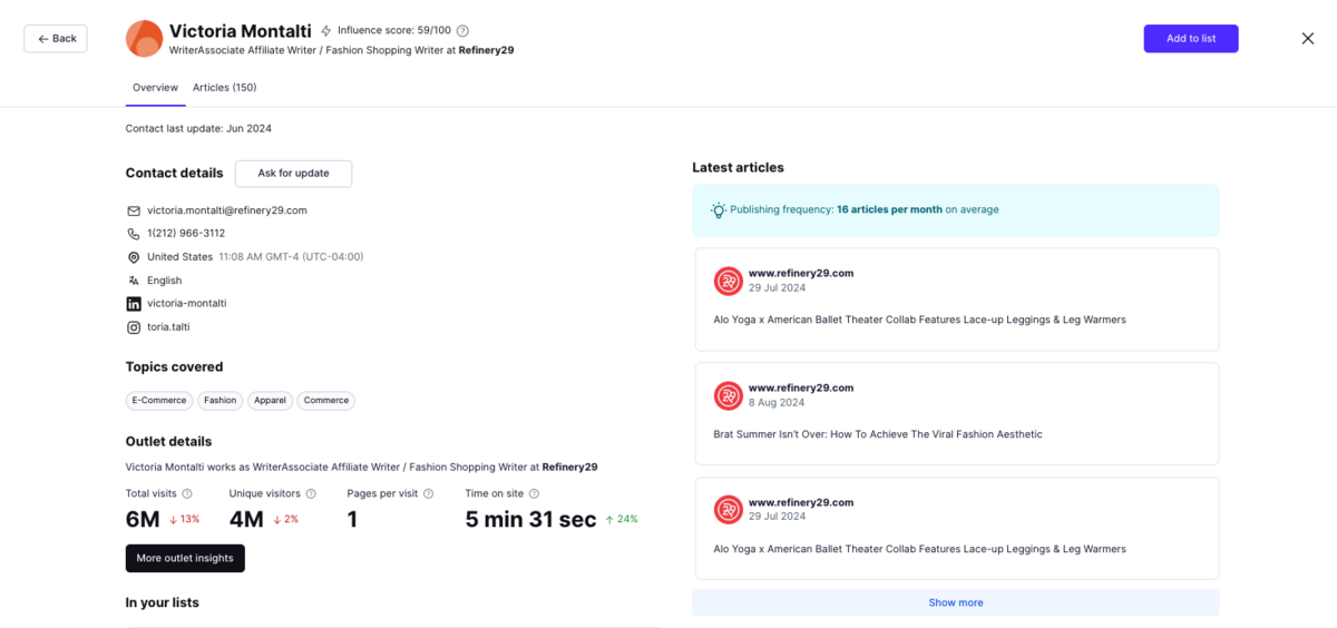 The ‘Recent Articles’ and Twitter feed overview in each journalist’s bio are great ways to check the frequency of their coverage and whether they actually write about relevant topics.