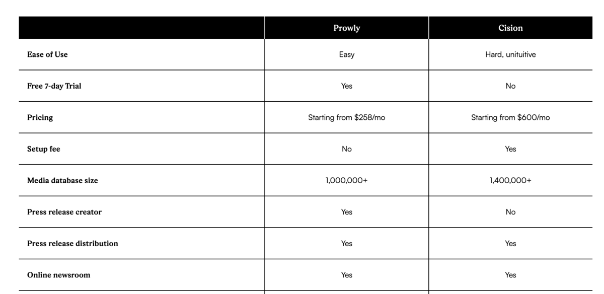 “One of the main advantages of Prowly and for exploring it was the cost-effective/flexible plan that they had in place. Most PR platforms tie you into an annual contract, and you have to pay in the region of $6,000 to $7,000+.”