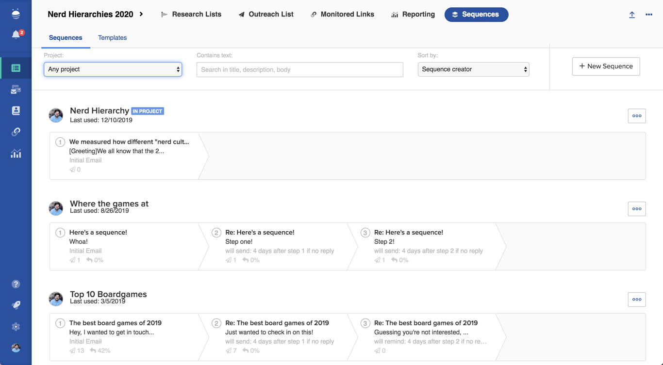 The last tab, Sequences, is where you’ll create and manage all of the templates and sequences for your campaign. This section will let you quickly edit or generate new templates and sequences, view template or sequence metrics, and even access templates and sequences from other campaigns.