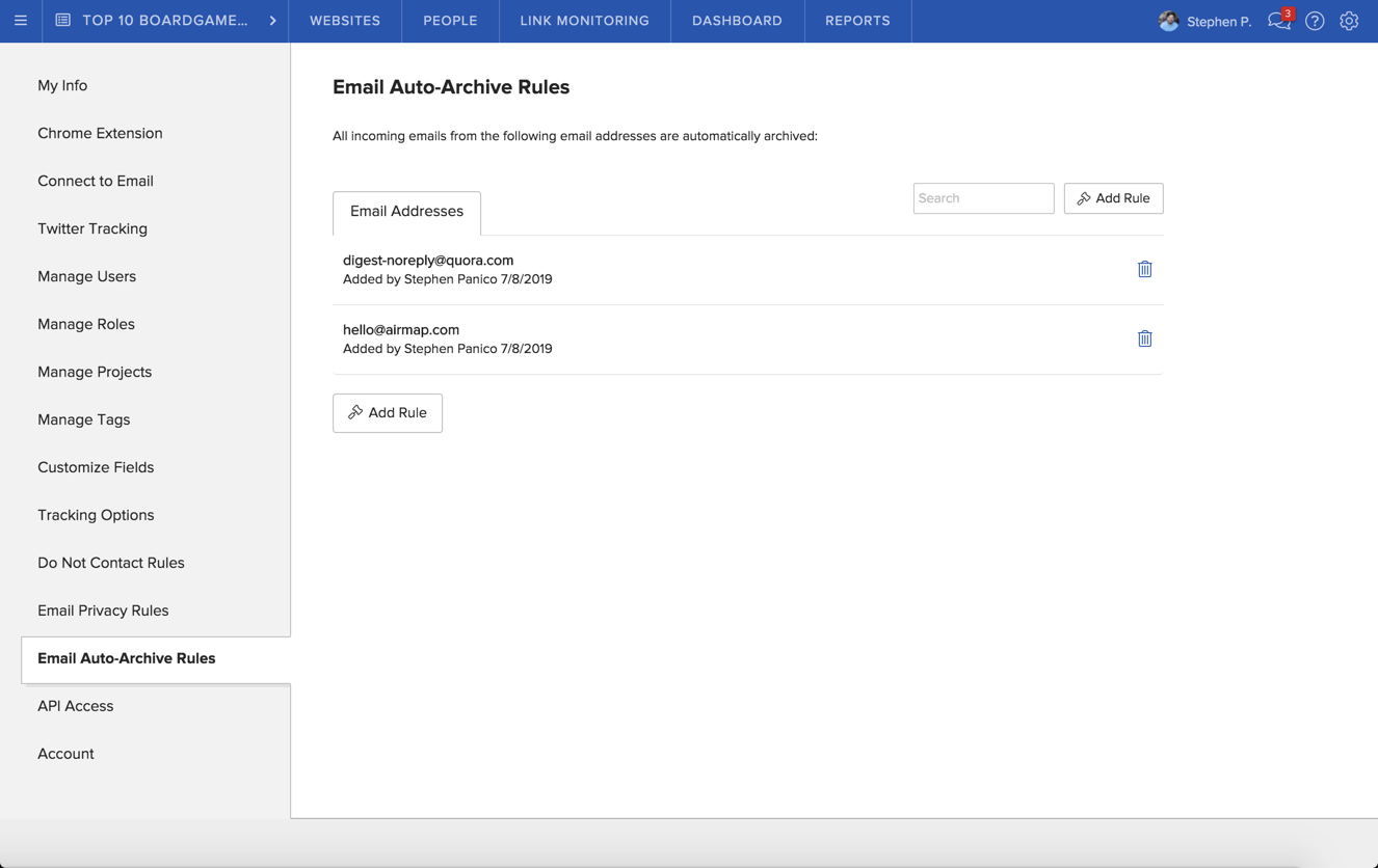 Because BuzzStream is pulling in emails that aren’t associated with websites/people already in your account, we wanted to give you a way to quickly clear out emails that are irrelevant and make sure emails from those senders never clutter up your unmatched folder again.