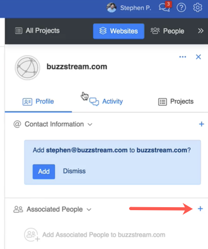 Rather than clicking on a BuzzStream suggested website or person, you’ll just need to click “Add to an existing Website/Person”.