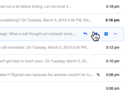 Email management is built directly into the inbox, so you can take action on any replies sent to you by simply hovering over emails sent to you. This lets you work through your email queue without ever having to leave the inbox to click into individual contact records or visit other mail clients.