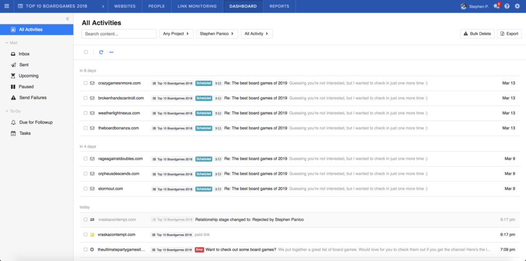 So if you wanted to quickly see all of your outreach as well as notes made by your team about those outreach efforts, you could just navigate to All Activity then filter across all projects and all users for emails, tweets, blog comments and notes for a complete view into your outreach for a project.