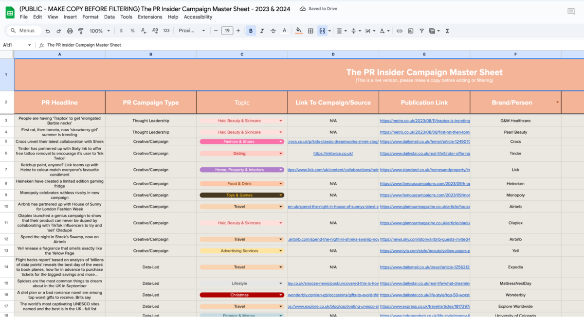 Then, a roundup of dozens of campaigns categorized by reactive PR, product PR, data-led PR, creative PR, and thought leadership.