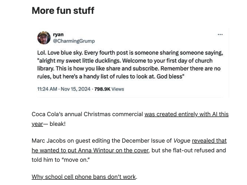 Realizing I can’t keep up with the fast-moving internet culture—especially Gen Z culture—this has become a welcome, albeit sometimes disturbing, value-add to my inbox.