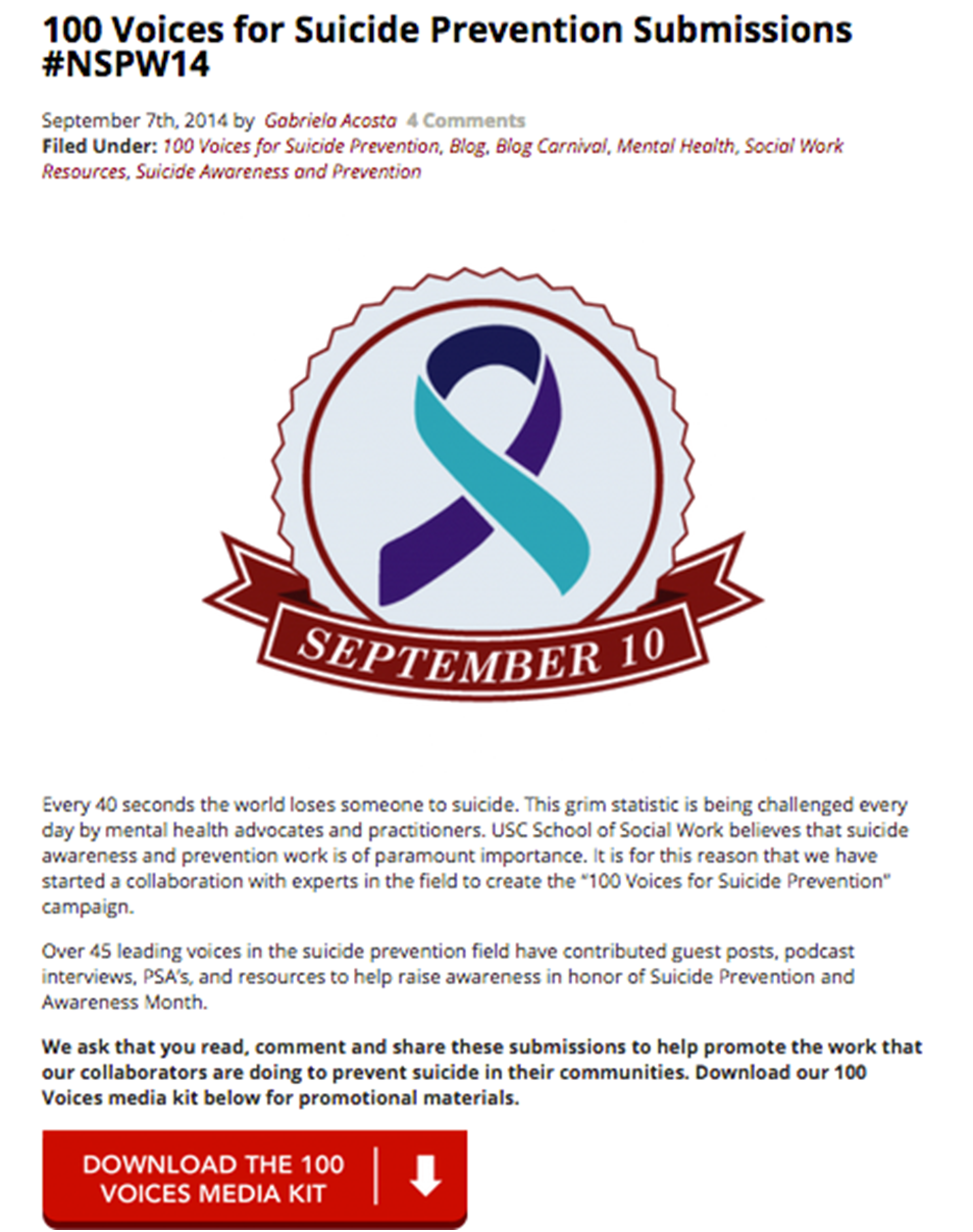One of our social work partner programs, the MSW@USC, hosts an annual 100 Voices for Suicide Prevention campaign to break the silence around stigmatized issues such as depression and suicide.