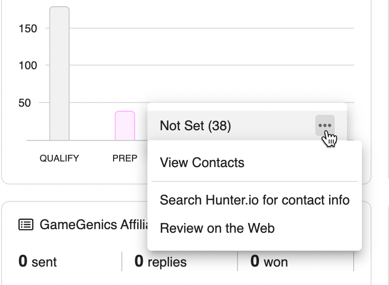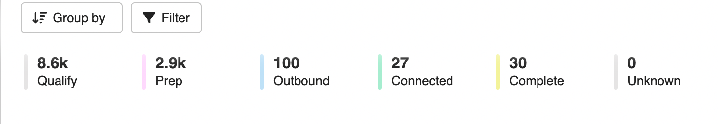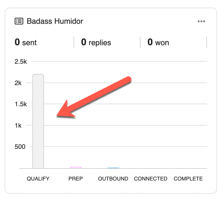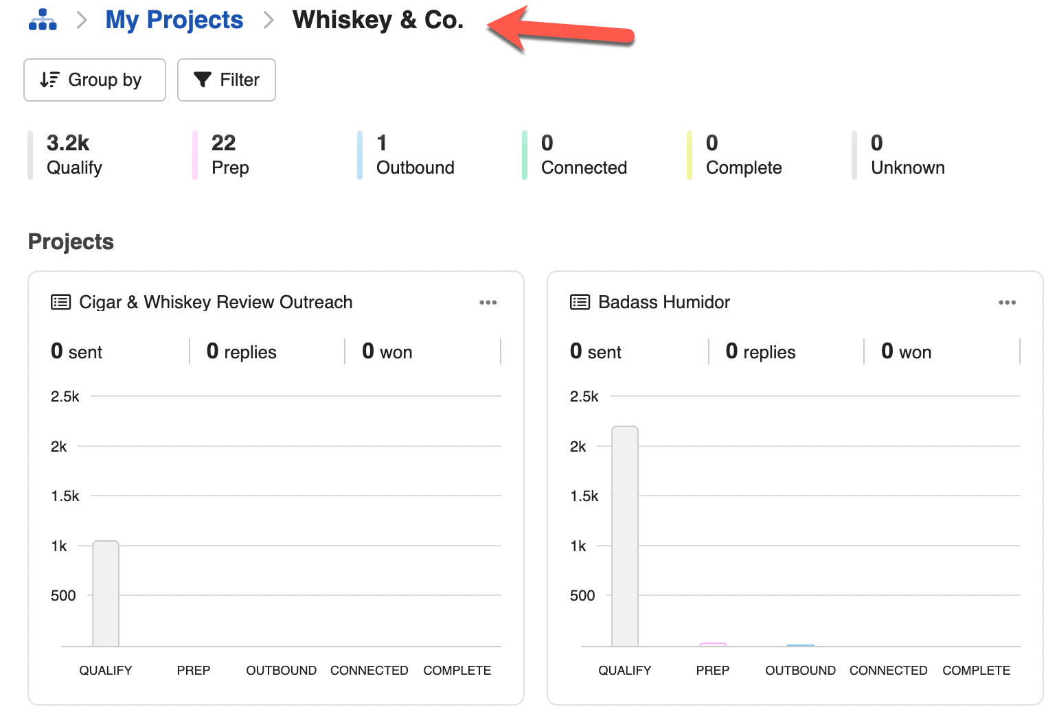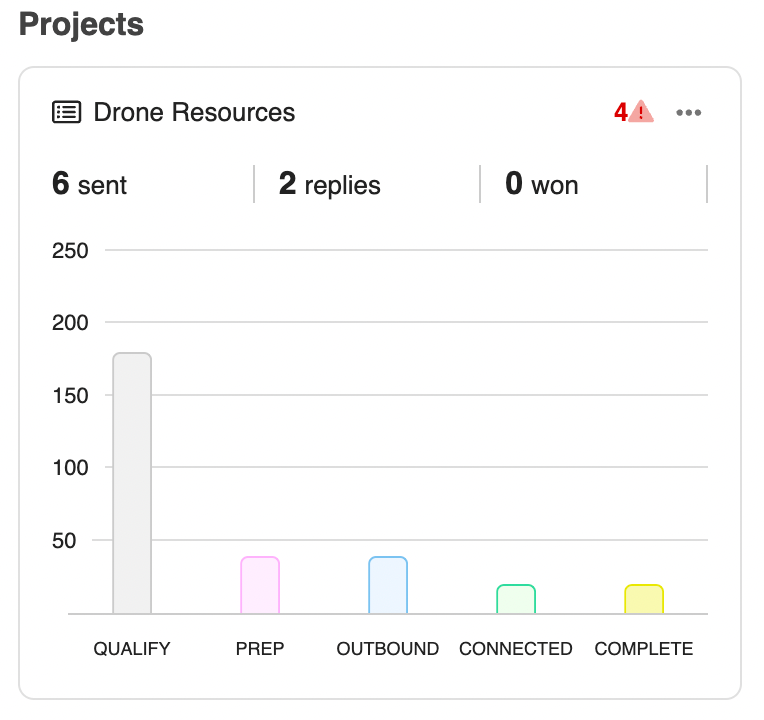 From here, you can look on a per project basis and determine whether you need to take action. For example, you might see that a project has a lot of contacts in the Qualify phase, but very little in Prep or Outbound.