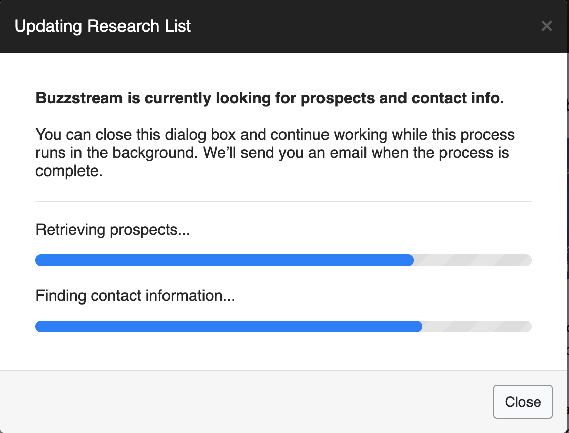 After entering my chosen seed terms, I simply let Buzzstream get to work building my research list…